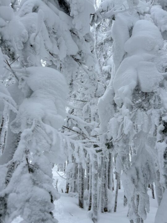 茶臼山へ。隣の山なのに植物の違いで雪の印象が変わります。