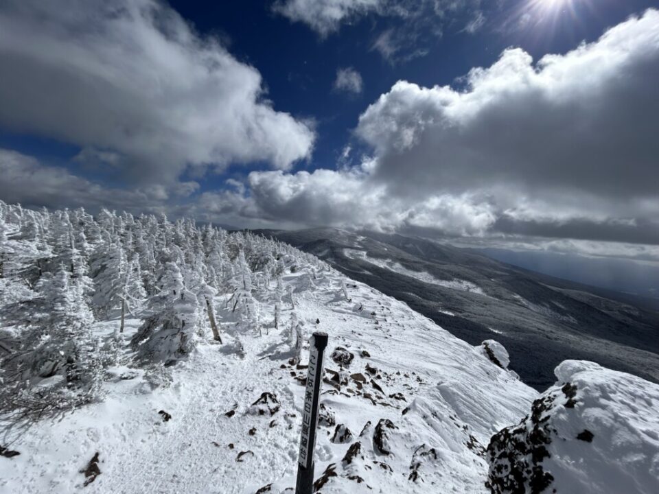 縞枯山の様子。雪の白、八ヶ岳ブルー、雲の白のコントラストは最高です。