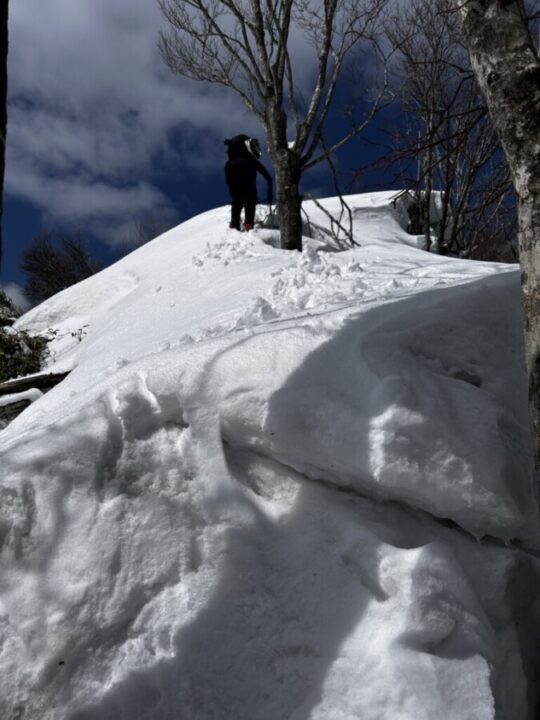 道中上から落ちてきそうな嫌な雪庇の箇所がありました(少し崩落した跡もあり)。向こうの方にクラックが入った斜面も見えました。気温があがるこれからは特に、雪の状態も注意箇所も刻一刻と変わりそうです。