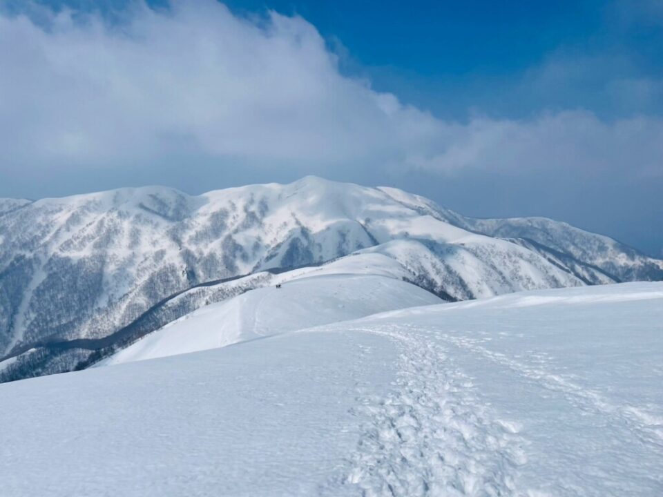 ここからが本番。銀杏峰の広大な雪原を過ぎると部子山へ続く真っ白な稜線が広がる。これが本当に見たかった景色!テンションが急激に上がる。