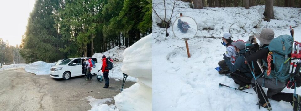 勝山から大野に入ると夜が明けて来て、まだ雪が残る田んぼ道の先に荒島岳や本日登る部子山が現れ、とても素晴らしい。程なくして登山口に到着。1年前は雪が無く、いこいの森キャンプ場の駐車場まで車が入れたが、今年は積雪が人の高さくらい残っているので、宝慶寺で通行止め。道路脇にスペースがあるが、数カ所に分かれても10台が精一杯といったところ。荷支度をして出発。
