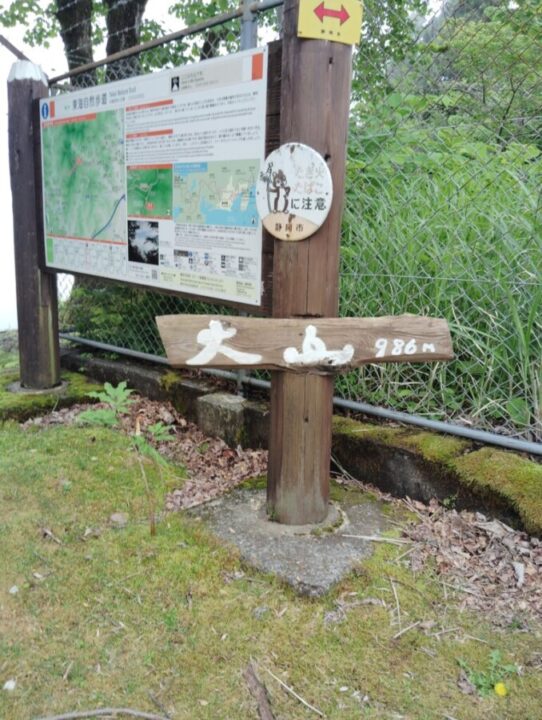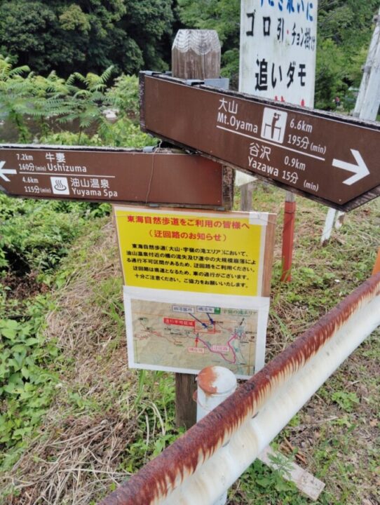 県道を歩いて寺島下バス停で東海自然歩道と合流した。寺島バス停をい右手に折れて車道を進み、大山山頂までつづらおれの車道をひたすら歩きます。NTT中継塔のための道路なのでゲートがあり林業関係者以外に一般車両は通らない。