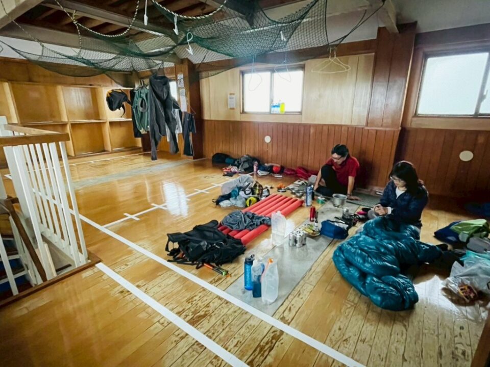広くてきれいな小屋の2階を、今日も我々の貸し切りで使わせてもらいました。トイレが小屋の中にあるので、こんな天気の日はありがたいですね。水洗で、とてもきれいなところも素晴らしい。水場は少しだけ離れていますが、危険個所もなく、5月くらいから豊富に出ているようなので、わりと安心してアテにできそうです。