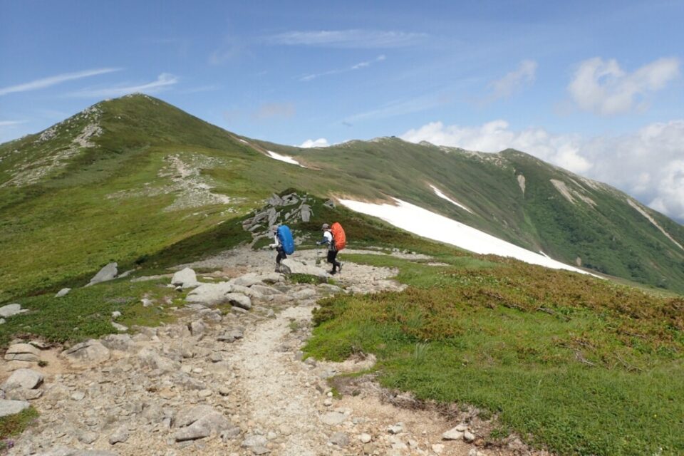 最終日は景色が見えていたので気持ち良かったですが、標高が下がっていくので暑くてたまらなかったですね。雪渓は確か2回だけど、他に岩稜帯がちょいちょい出てきました。所要時間は、休憩込みでヤマレコの4割増しでした。暑かったからか、岩場のせいか、今日もゆっくりペースでしたね。
