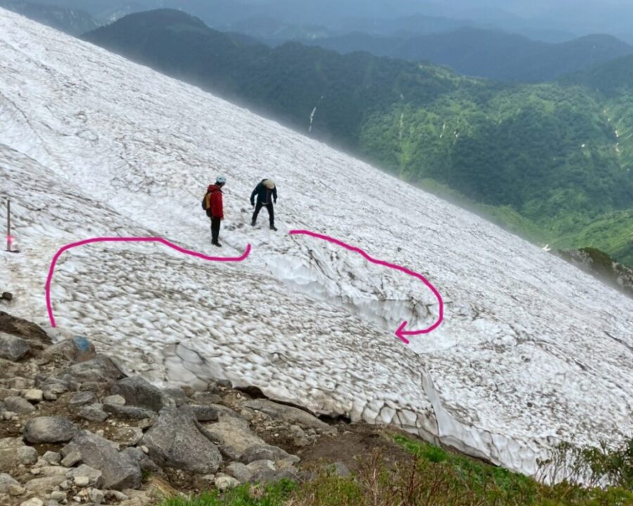 小屋番さんの「夏道は、必ず雪渓の右手にあるから」という言葉を胸に、梅花皮小屋を出発。