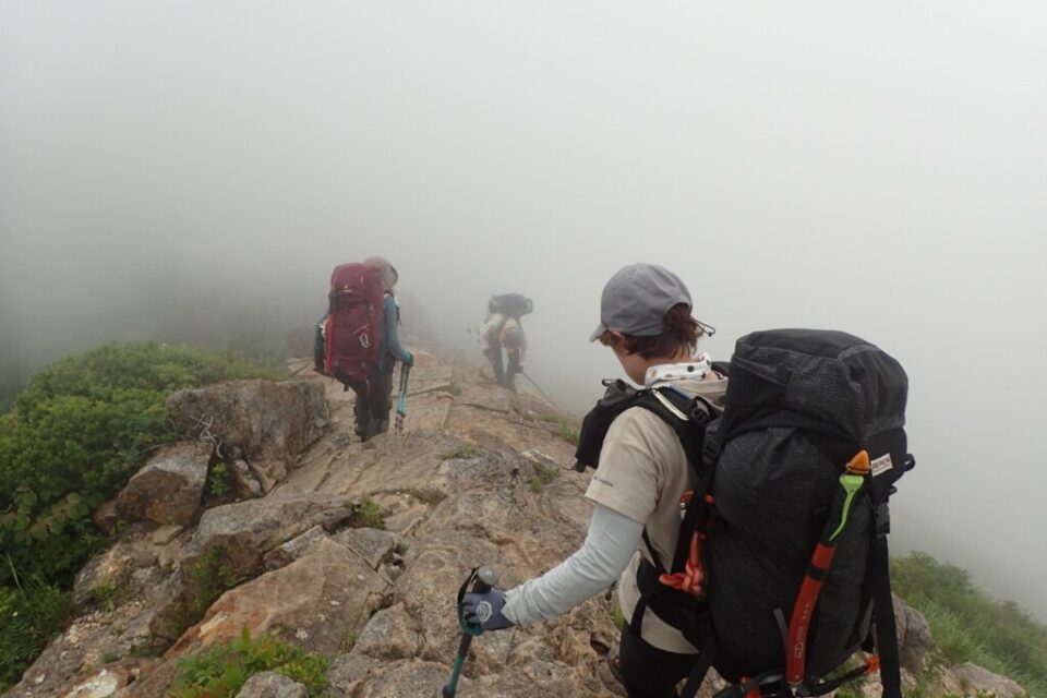 本隊は丸森尾根を登ります。結構大変でしたね。標高差はあるし、湿気って暑いし、雨は降ってくるし、ガスって視界は悪くなるし、主稜線に出たらよろけるほどの風だし、命の水が一升もあって重たいし。ん?最後のは自分のせいか。