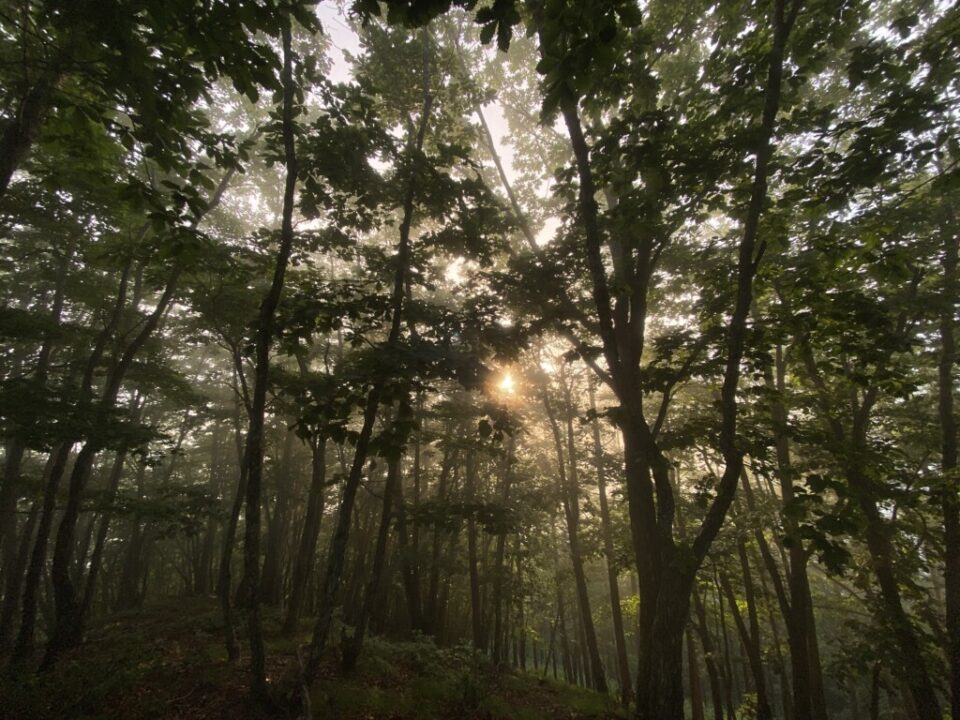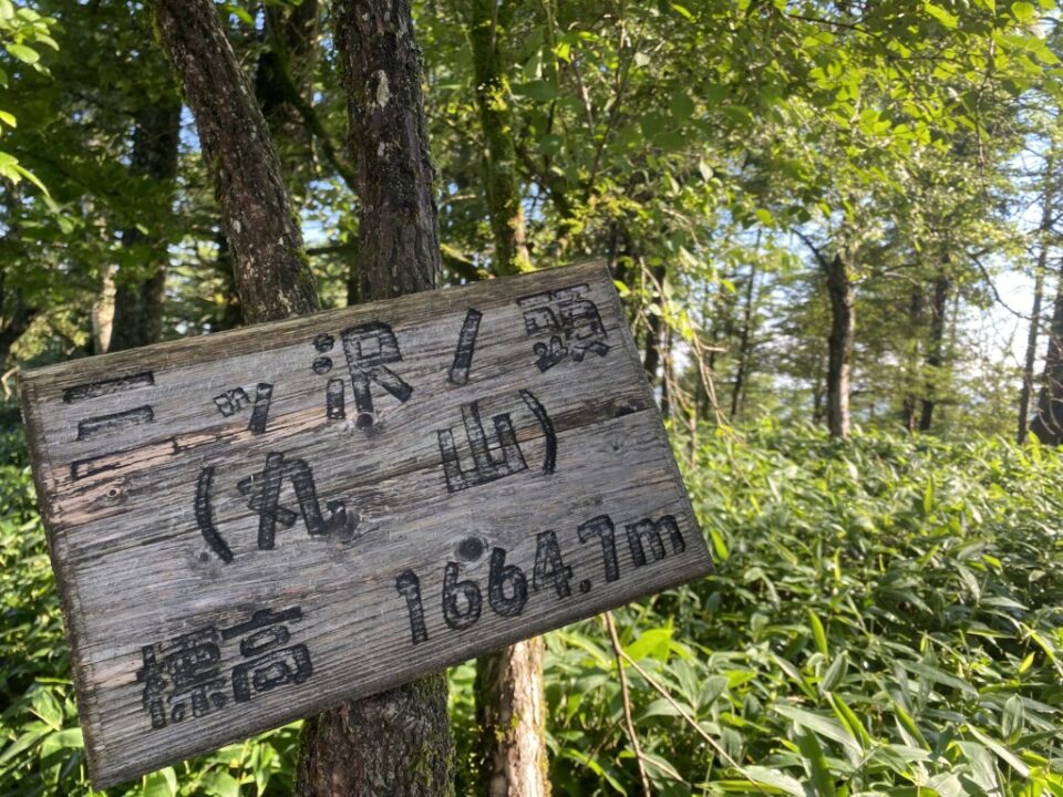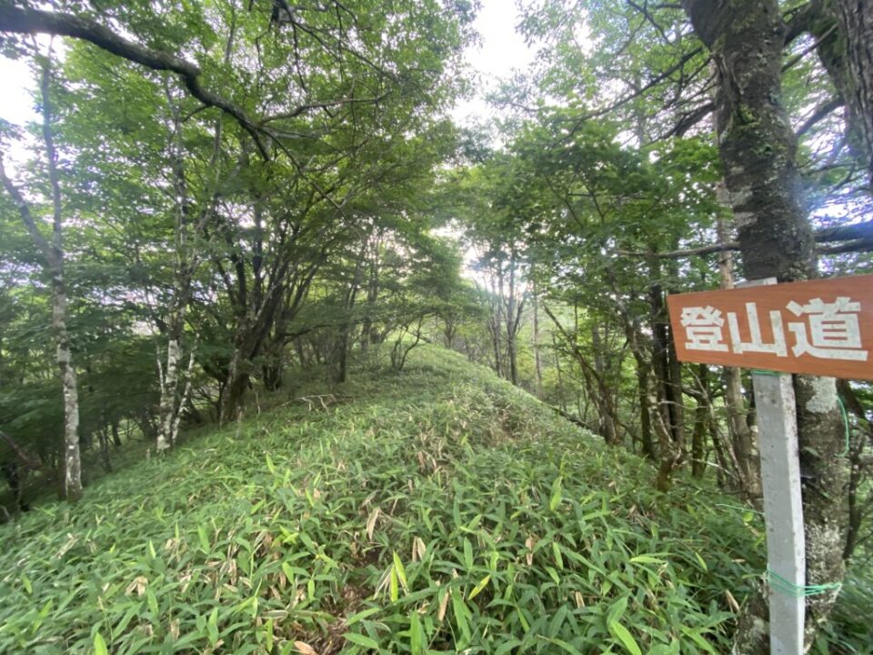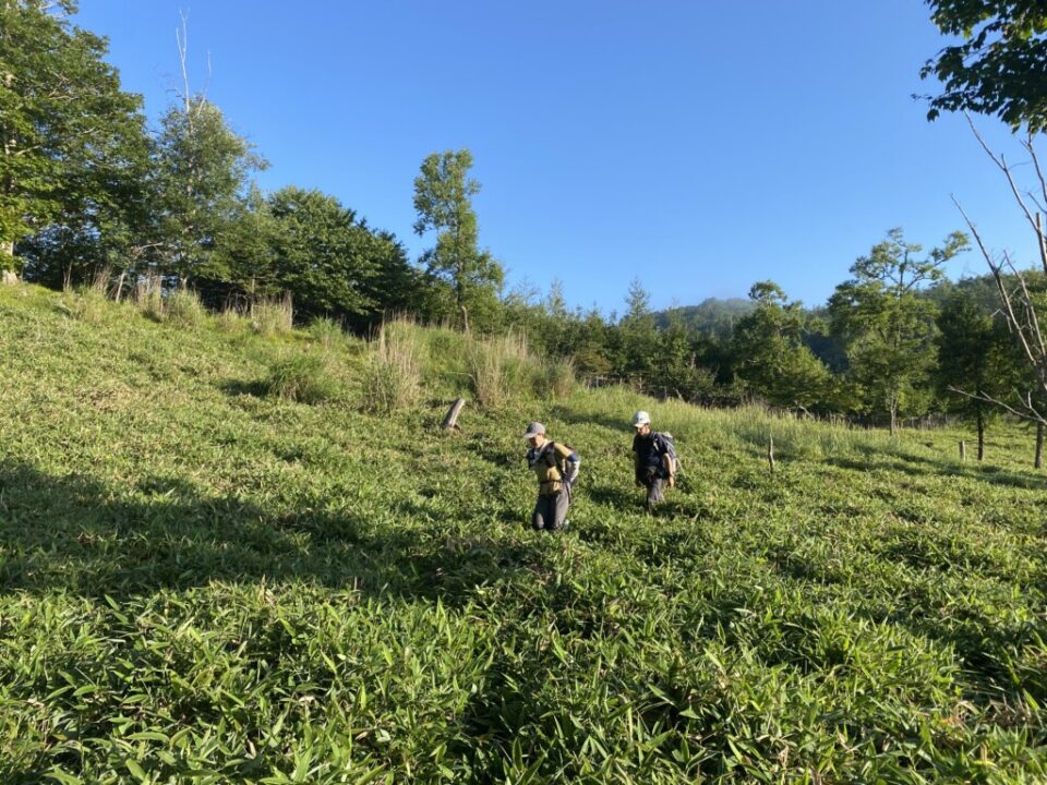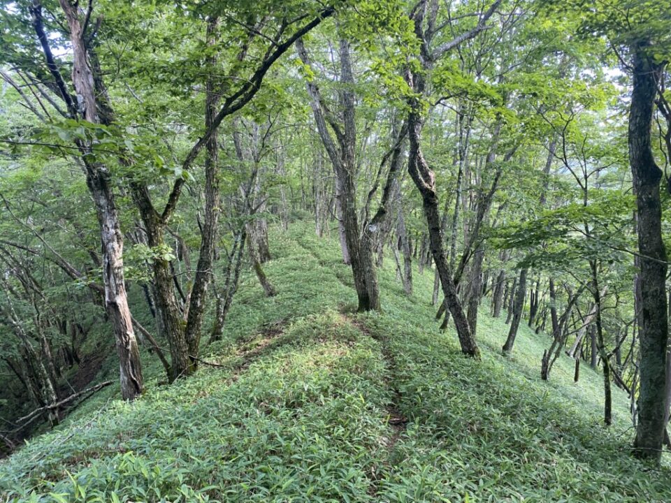 前日、偵察した際スタートから朝露に濡れた笹で早々から擦れる事が分かっていたので下はレインを履いてスタート。尾根に乗ってしまえば笹藪は薄くなり陽も出て暑くなってきたのでレインは脱いで尾根歩きを開始。