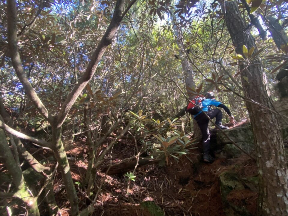 萱ダワから先はシャクナゲの薮が点々と。事前リサーチでは「相当な激藪」と思っていたので、実際にはそこまで酷くはなく、永遠に続く薮道ではなかったので安心した。以前に行った三ノ沢の独標尾根と比べればなんて事なかった。ただ、通常ルートでないのは確かなルートだった。