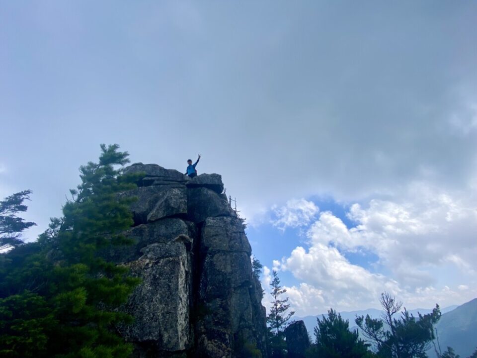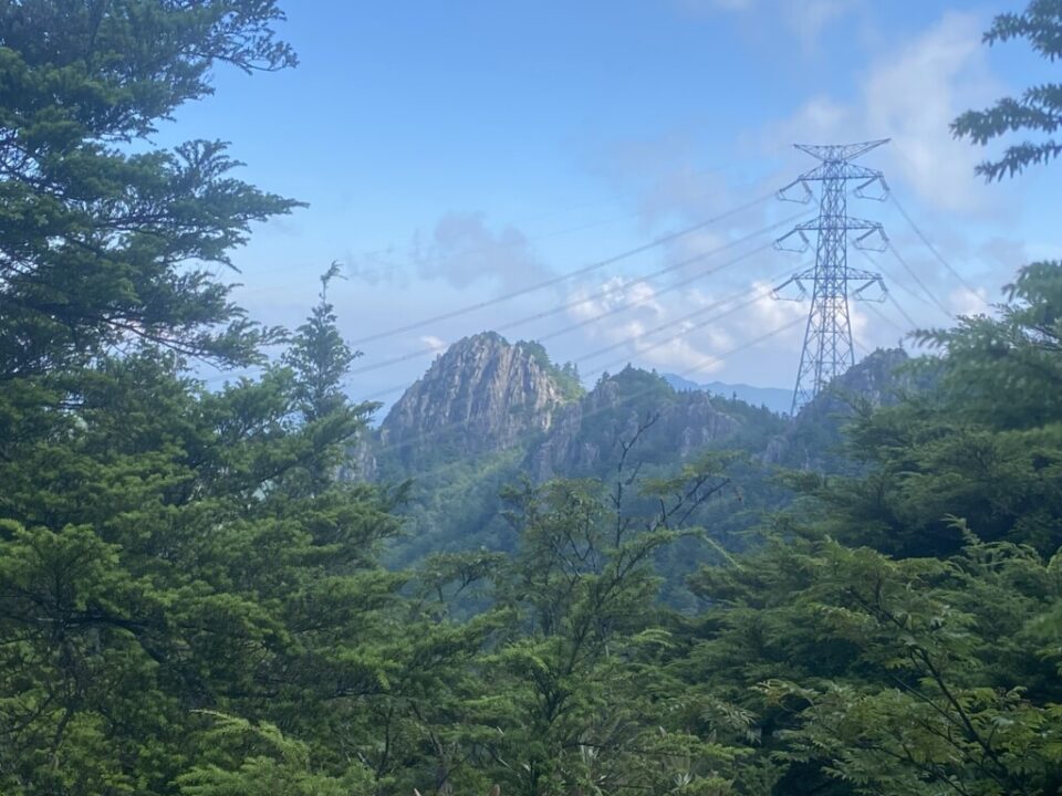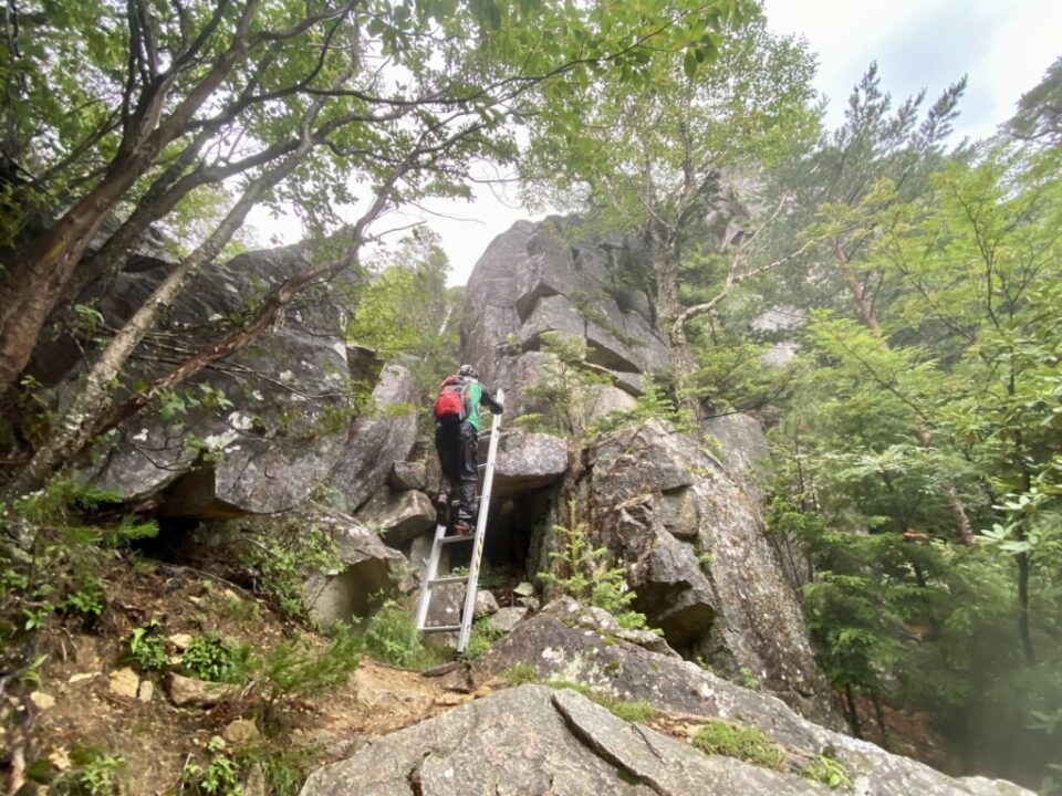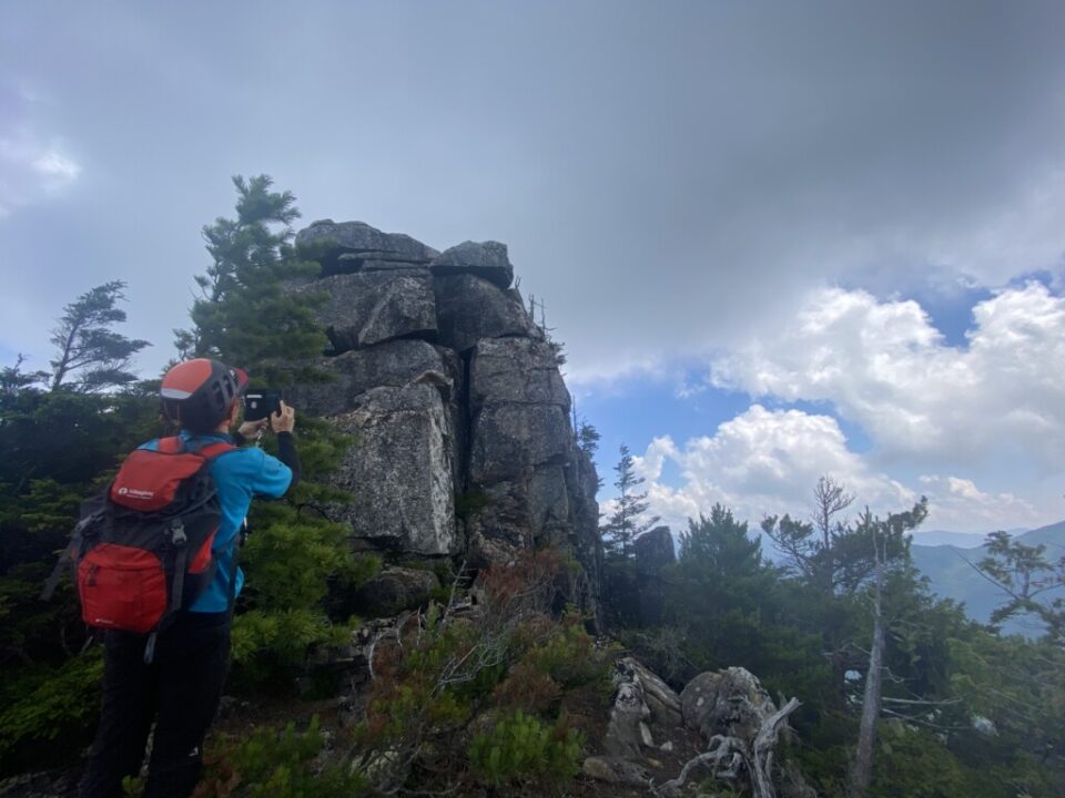 徐々に雨雲が近づいてきているのにも関わらずどうしても寄ってみたかった大双里の先にある「岩があるらしい」場所へ。金峰山にも行ったことはないので分からないが小さいバージョンの五丈岩みたいな岩があった。私は怖くて途中までしか上がれなかったが、Y澤さんに上まで上がってもらってその先に見える「謎の岩塊」方面の稜線をのぞいてもらった。
