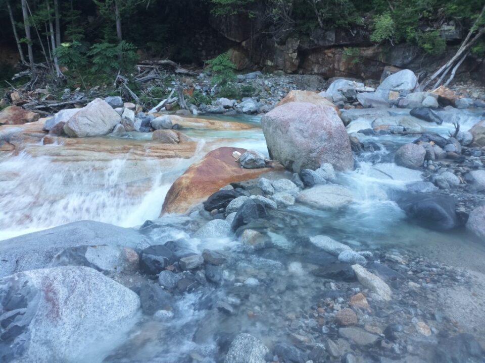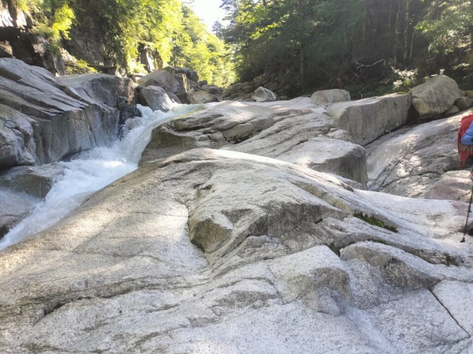 水は冷たいが、渡渉する程度なら問題ない。河原が広く、今日は快晴なので気持よく進める。何度も渡渉しながらゴーロ帯を先へ進む。水流は多いが、浅い箇所もたくさんあるので、渡渉に困ることは少なかった。