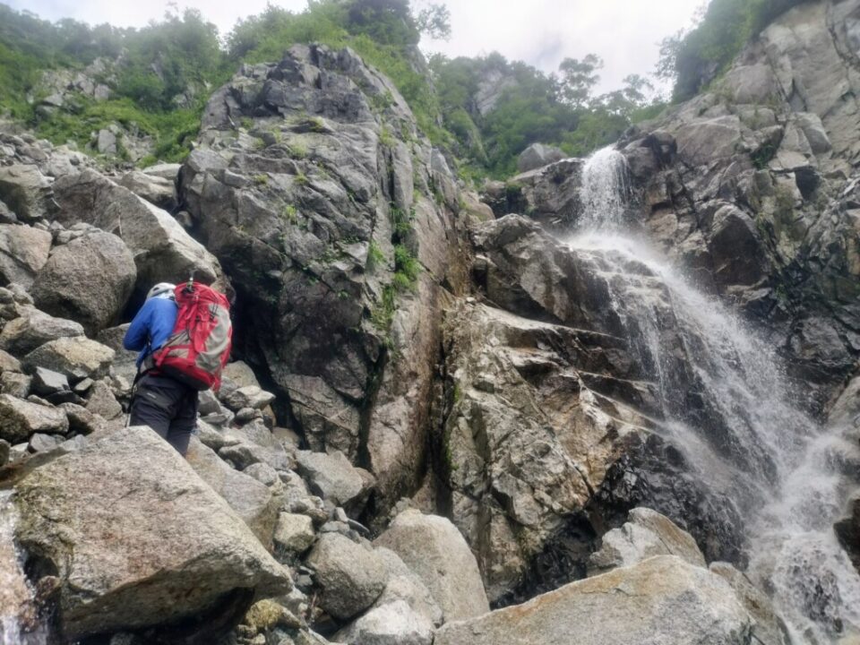 次はナメ滝で、足を滑らさないよう気をつけて通過。3つ目がそこそこ大きく10m以上。右岸にある支流から巻けないかと思って見に行ったが、ちょっと危なさそう。もう一度、滝の下に戻る。真下から観察して、水流の左側が行けそう。確保してもらって登攀開始。掴んだ岩が次々と外れる。信用できないのでホールドをバシバシ叩いて確認しながらゆっくり登る。支点には岩角にスリングをそのまま掛けた。こんな支点でもあれば気が楽になる。登ってみれば、そう難しい所はなかった。
