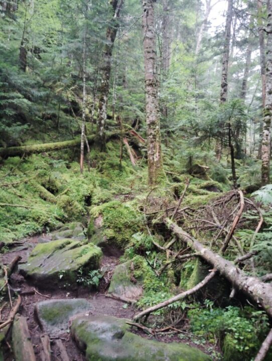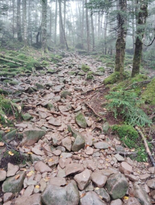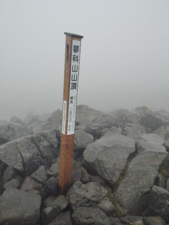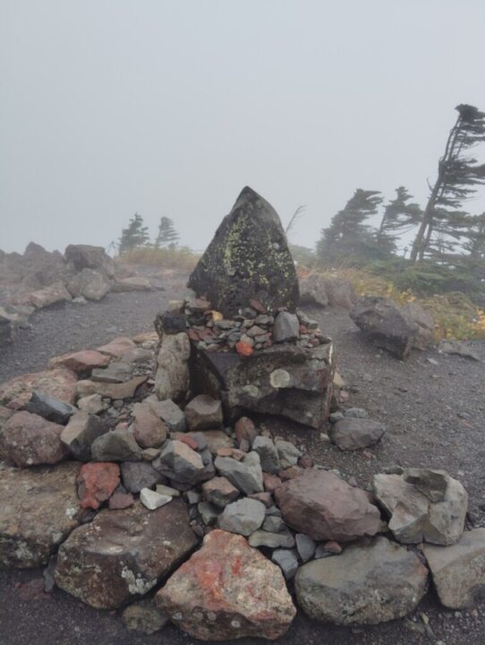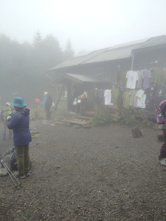 ガスの中、風が強い。雨は降っていない。カッパの上下を着て日帰装備で蓼科山へ向かう。登山道に入ってすぐ暑くなりtシャツの上の長袖を脱いだ。急坂を通過すると登山道がきのうからの雨で川になっている。石の上に靴を置いて進む。整備された歩きやすい道だ。雨予報のせいか人は少ない。