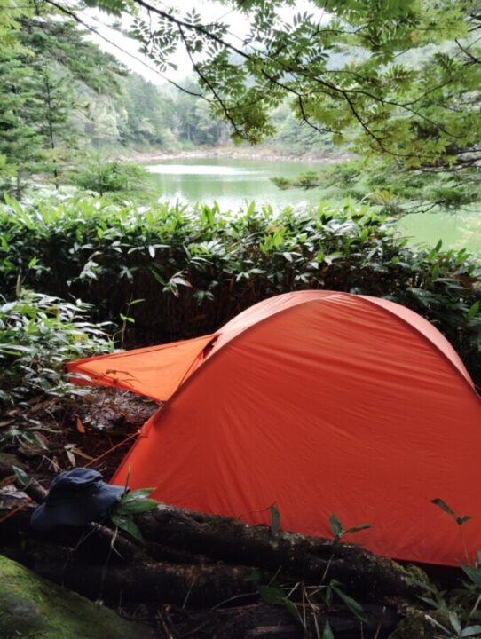 双子池ヒュッテのトイレは外の仮設トイレを利用する。水は雄池の水を汲んで殺菌しているそうだ。ウイスキーの水割りを飲んだが美味しかった。雌池側にある双子池のテント場は山の笹を刈ってあるスペースなので平らなところは少ない。電波は届いていない。