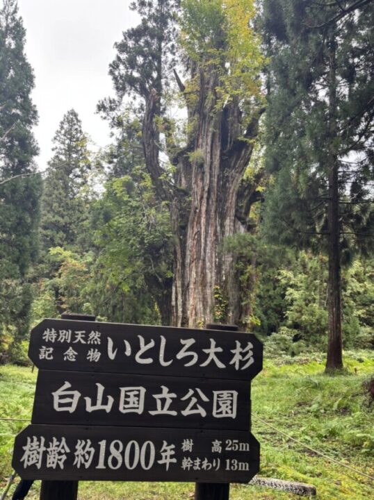 - 10/19(日)豊田市内駐車場(5:00)=石徹白登山口(8:03)ーいとしろ大杉(8:14)ー避難小屋(10:06)ー銚子ヶ峯(11:19 -11:50)ー避難小屋(12:53)ー石徹白登山口(14:53)=満天の湯=夕食=豊田市内駐車場(19:30)