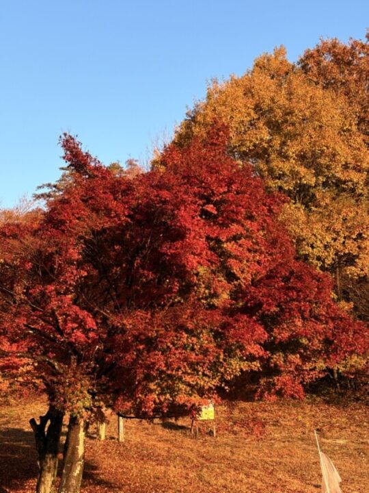 大谷山からはまた樹林帯を下るので眺望は無しでした。落ち葉の体積が凄くて、その下にある石や枝に足を取られるので、気を使いました。所々で獣臭がし、数日前に糞の報告も挙がっていて、今回も途中で糞を見つけたので、笛を吹きながら下山しました。少し緊張もありましたが、イワカガミの葉が群生していたり、標高400mくらいから登山口までは色づいた紅葉とその落ち葉で視界全体が黄色く染まるほどで、基本的には楽しんで下山できました。