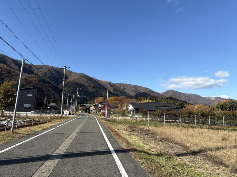 大谷山下山口からメタセコイヤ並木へ向かう道中、振り返ると登った山と歩いた稜線が見えました。大谷山山頂から大谷山下山口、そしてメタセコイヤ並木の近くまでは誰にも会いませんでしたが、メタセコイヤ並木のところは観光客でいっぱいで、並木道も車とバイクで大渋滞でした。メタセコイヤは黄金色に紅葉していて、樹が道路をトンネルのように覆っていて圧巻でした。