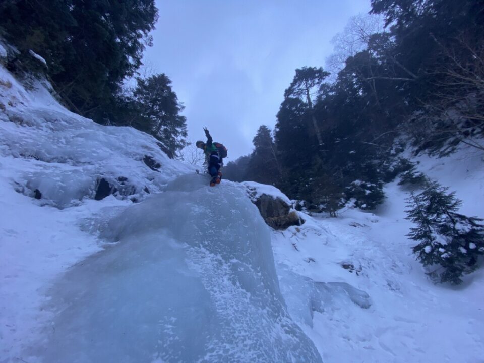 Y澤さんが躊躇せずフリーで簡単に上がってしまったので、「あ、そんな感じで行けるのか?」と。Y澤さんにロープを出してもらい、Y本さん、N田さんにざっくりと登り方を聞いて「とりあえずやってみよう!」とやってみたが、思った以上に全然上手くいかず、本当にとりあえず上に上がった感じでアイスデビューとなりました。