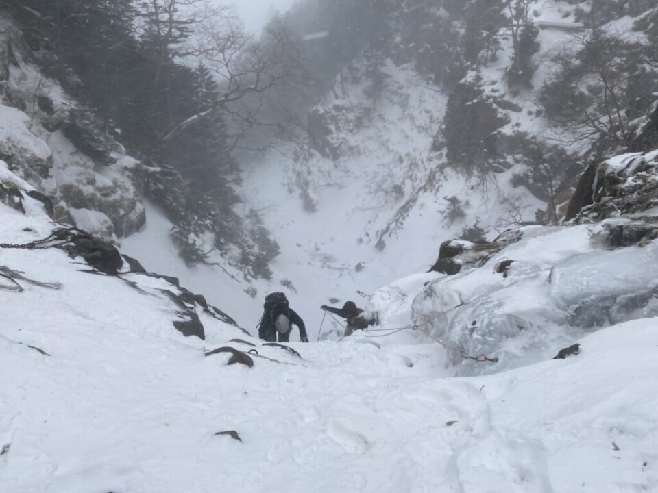 F2の上は風の抜けが多く雪も強まってきたこともあり寒い。寒がりなN田さんが登り切ったら多分、寒さの限界だろうなと思いながら2人が上がってくるのを待った。しっかり冷えてきたので懸垂でF2を降りる事を決めた。事前にアイスで懸垂下降時はエイト環が良いと聞いていたが、本番で使った経験がないため、不安なので今回はいつものデバイスで降りた。