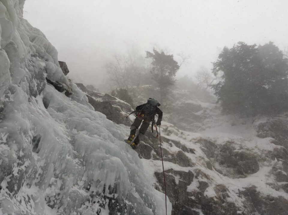 F2: F1の2倍以上高さがありそうな滝で、階段上にボコボコと凍っていているのに氷の下にはまだ水が流れていて、アックス刺したりスクリューを刺すことで中から水が噴き出ないのか気になってしょうがなかった。先行パーティーが取り付いていたため、少し待ってから左側を登る。風が徐々に強くなり雪も降り出してきた。