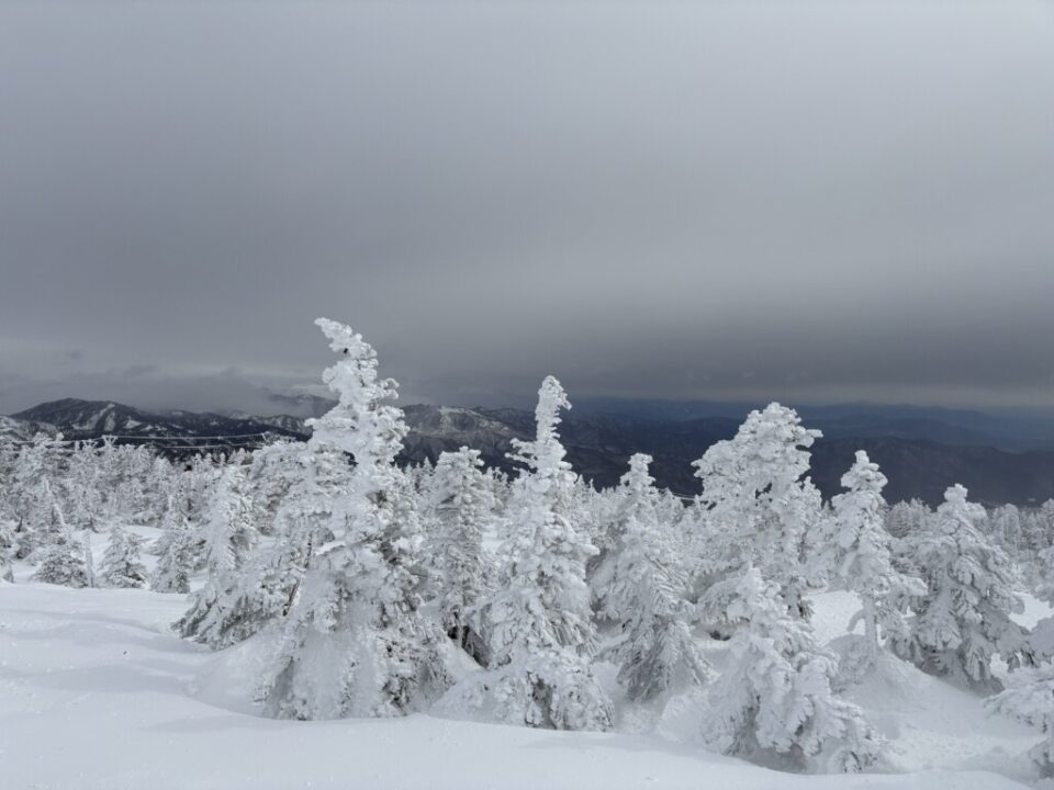 日曜日より土曜日のほうが気候条件が良さそうと判断して、土曜日に横手山に登ることになりました。陽坂の駐車場はたくさんの車がいましたが、まだ余裕はありました。リフトに乗るので、寒さ対策を万全にして、スキーとスノーシューを持って出発。リフト乗り場でリフト券を購入し、2つのリフトを乗り継いで横手山ゲレンデトップへ。カフェの1階スペースで、着込んでいた衣類を脱いで調整してから、スキーやスノーシューを装着して歩き始めました。一瞬の晴れ間があり、稜線に伸びる国道を見ることができました。すぐに横手山山頂に到着。山頂付近ではチビスノーモンスターを見ることができました。少し進むと、長野県と群馬県の境目に建つ渋峠ホテルに到着したので、お決まりのポーズで記念写真を撮りました。