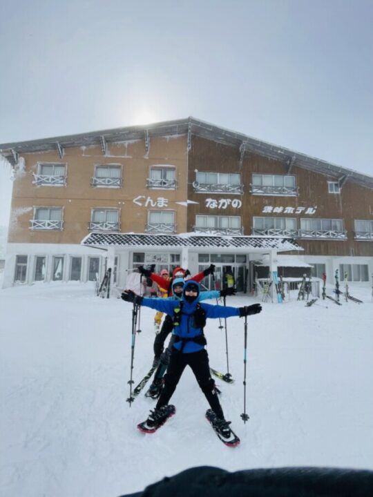 池ノ塔山に向かい、ピークだと思ったところでヤマップの地図を確認したところ、ドンピシャで上がりました。国道最高地点を目指して歩いている途中、初めて歩いている人に出会いました。お話をうかがうと、朝草津から上がってきて、これから草津に下りるのだということでした。どの方向に向かって下りるのか考えながら進んでいたところ、またまたドンピシャで最高地点に下りることができました。その後、暖かい渋峠ホテルで昼食をとり、トイレも使わせていただきました。ちらほら雪が舞う中、国道292号線をひたすら歩いてゲレンデに向かいました。私とH川さんがスノーシューで歩く横を、スキー隊のみなさんがスーッとスキーで滑って行くのを見て、とてもうらやましく思いました。ゲレンデに着くと、スノーシューメンバーは他の方の邪魔にならないよう、すみの方を歩きました。