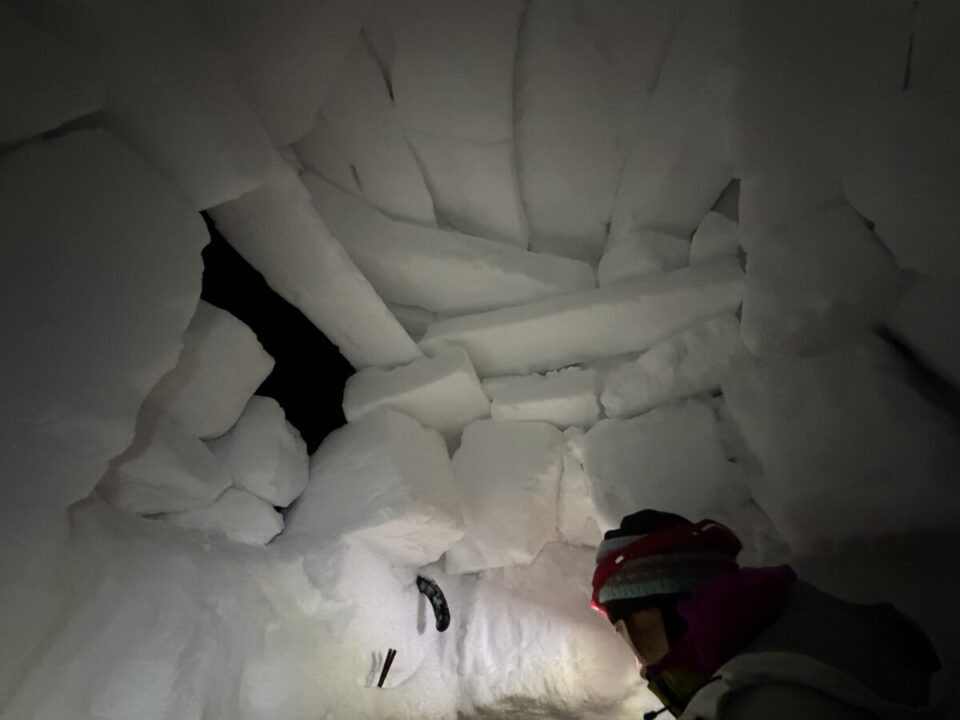 16:00 やっとイグルーの作成。30分もすると日が落ちてしまい凄く寒くなる。イグルー本体はひとりで作るので私は外から穴を埋めるだけの係となった。それでも切り方を教わり楽しかった。さすが10作目との事で1時間で出来上がった。後は穴を丹念に埋める。