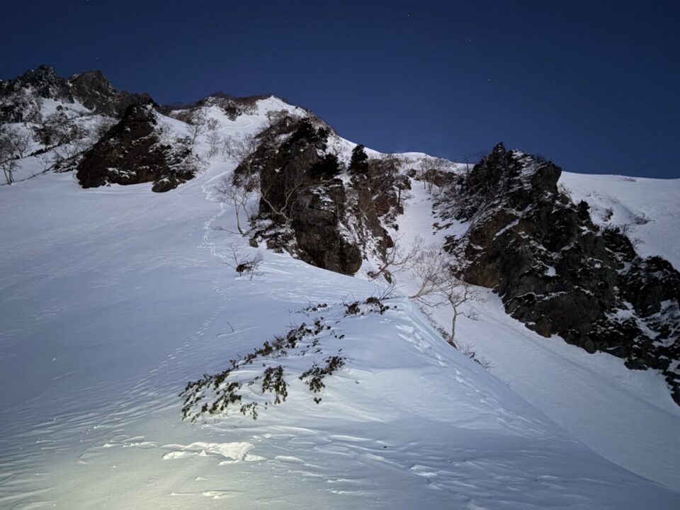 まずは取付きを何処にするかを相談しながら、良さそうな降り点を考える。それに向かう最良のトラバースを考える。結果3本トレースを付けてしまったが、翌日はスムーズに取付きまで行く事が出来た。