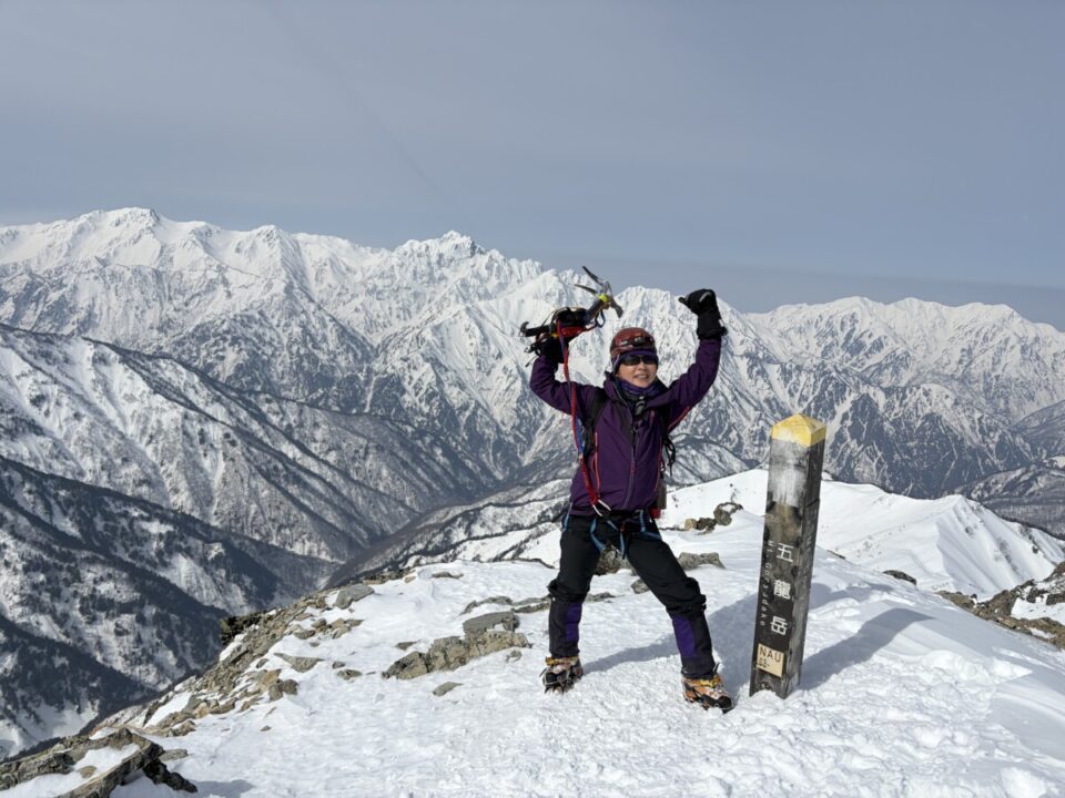 9:40 五竜岳登頂。ここまで来ないと見えない北側の景色は夏よりもずっと綺麗でカッコ良かった。貸し切りの絶景の中酔いしれているが帰りが大変。