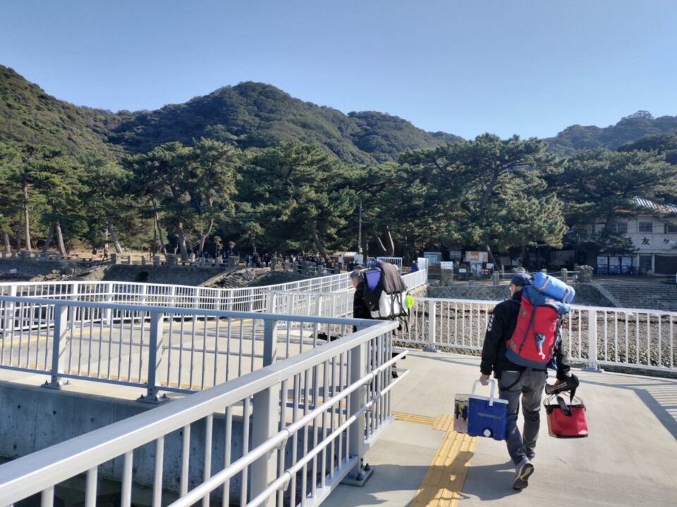 乗船時間が来て小さい船がやってきた。私の他に二人、釣り人が来て乗船した。内海なので波は穏か。たくさんの釣り船を見つつ、20分ほどの乗船で友ヶ島の野奈浦に着く。我々が降りると、帰りの観光客が大勢乗り込んでいった。もう時間的に島内に人は少ない。