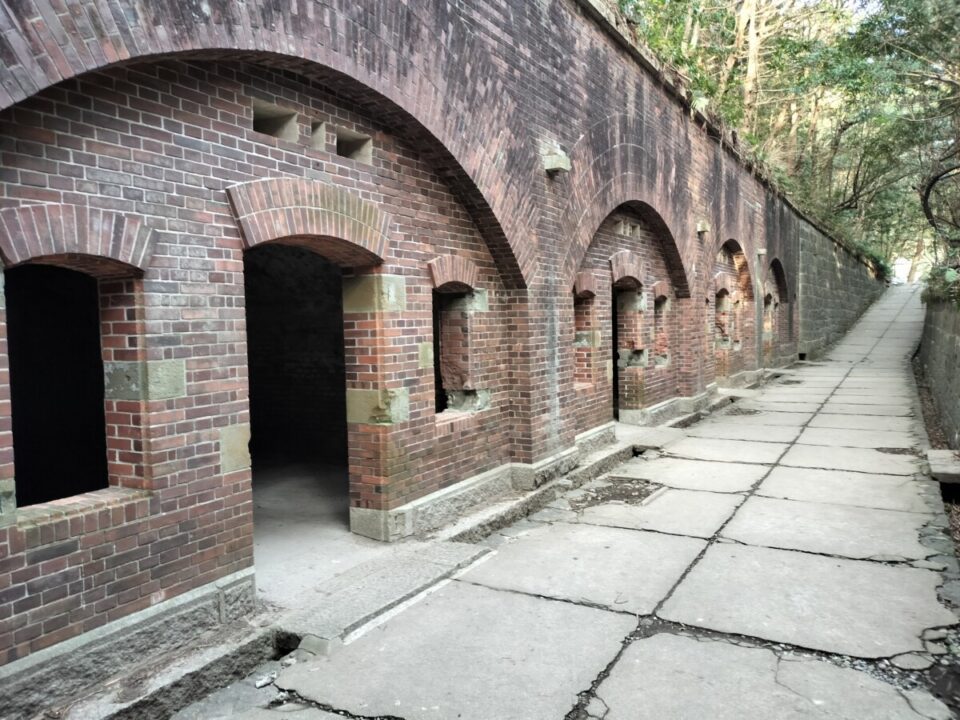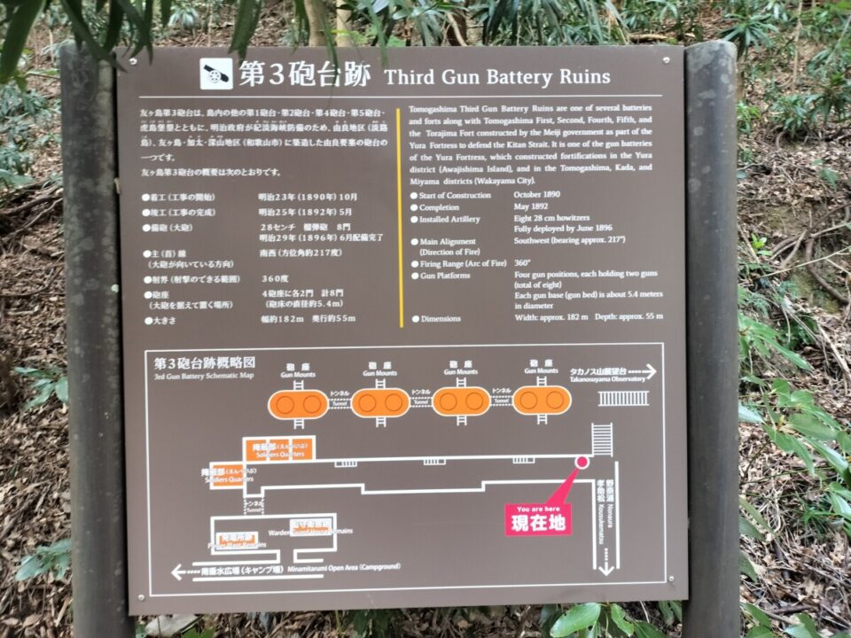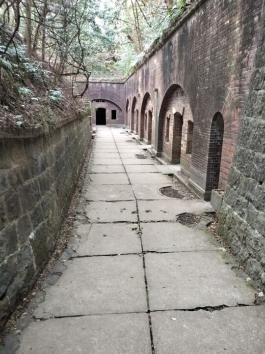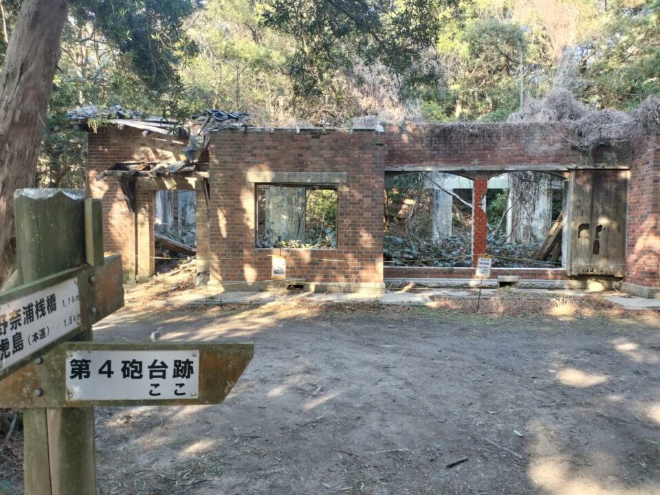 山道を越えないとキャンプ場に行けない、とHPなどに書いてあったが、観光地なので道はしっかり整備されており、急坂も短かかった。テン場への分岐で一旦ザックを下し、第四砲台跡へは軽いザックで向かう。友ヶ島は明治時代に大阪を守るために作られた砲台跡、弾薬庫跡などがたくさんある。