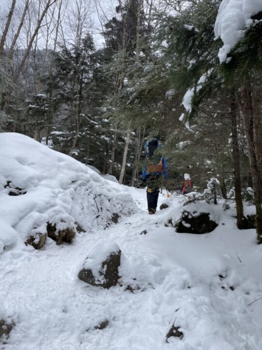 例年より雪は少なく感じた。赤岳鉱泉までは緩やかに標高を上げながらツボ足で樹林帯を歩く。凍結もないし特に危険なところはない。