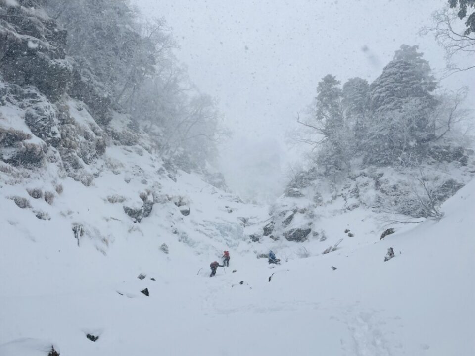 ジョウゴ沢のF1は巻き道があってトップロープで登れるということだったが、巻けそうなところはどこもない。雪が激しく降っておりザックを開くたびに雪がザックの中に入る。でもせっかく来たのでザックからアックスを外し、凍った滝に打ち付けてみる。事前にYoutubeでしっかり勉強したのを実践してみる。アックスの先ががっつり効いたときは気持ちよい。