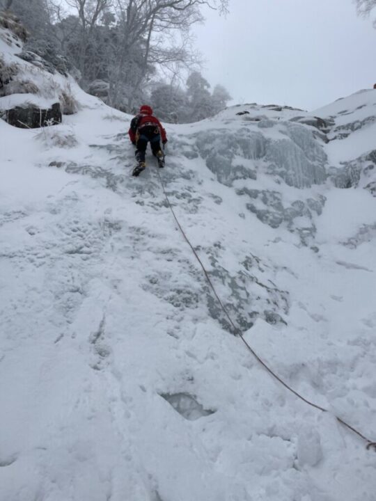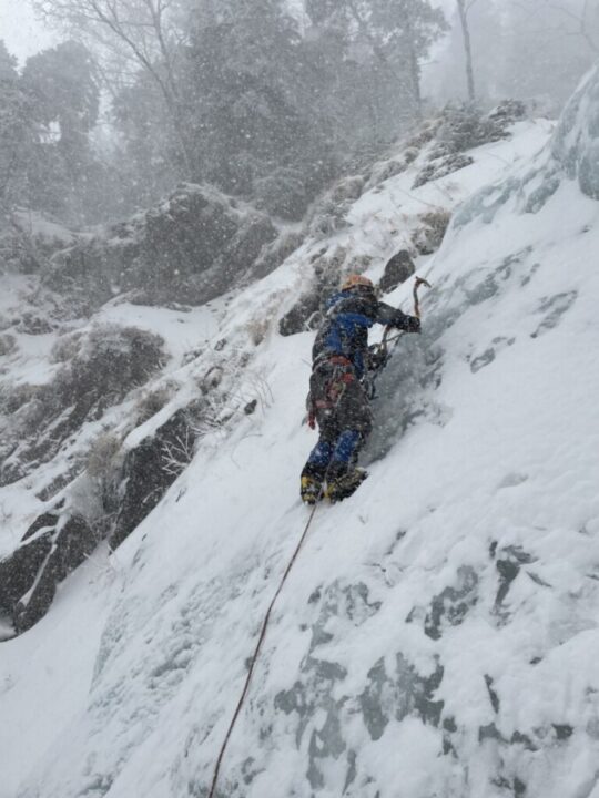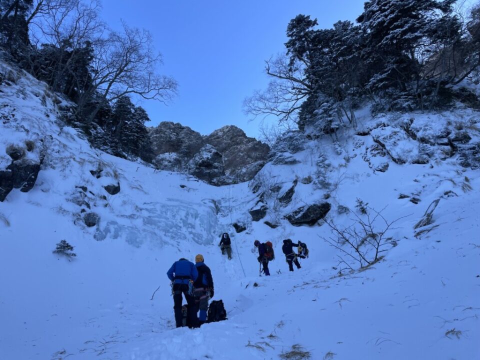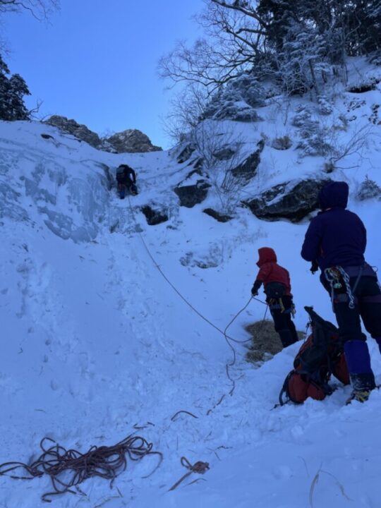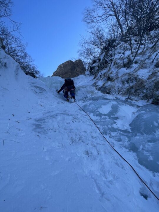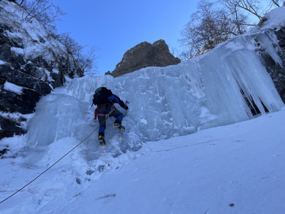 取付きにつくと先ほどの2人パーティとは違う4人パーティが登攀を開始していた。昨日とは違う右側のルートから登る。なかなかアックスをがっつり効かせるのが難しい。アックス以上にアイゼンを蹴り込むのも大変だった。膝を軸にして振り子のように蹴り込むというコツを教えてもらった。Y本→私→N田→K田→H阪の順で登る。