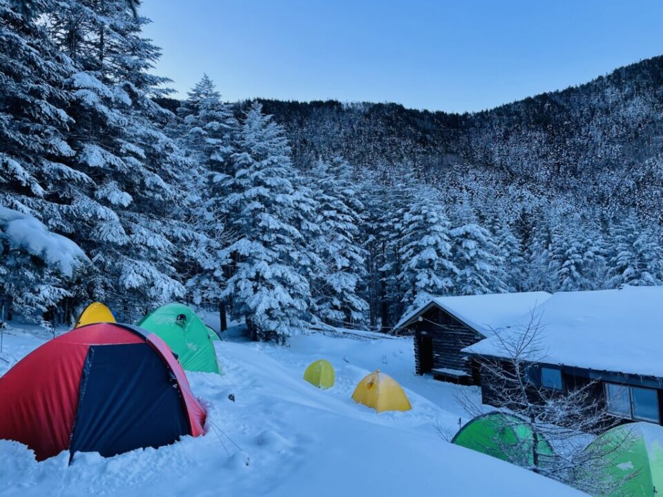 暖冬のため名物のアイスキャンディーも育っていない。厳冬期はキンキンに冷えた八ヶ岳も今年は暖かく感じた。素手でも手が痛くなかった。テント代1人2000円を支払いテント設置。水は小屋からもらえるため水作りをする必要がない。トイレも使えるのはありがたい。超快適。