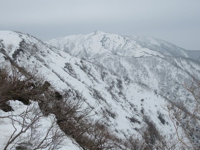 ここからやっと登山道に残雪が出てくるので、アイゼンを装着。前山を越え斜面がなだらかになってくると銀杏峯へ到着する。ここまでは先行者が1名いたが、下山されるようなので自分でトレースを付けていかなければならない。更にワカンを持ってこなかったので足が沈んで決行疲れる。体力的にはまだ余裕があったが、天気も良くならなかったので、部子山が良く見えるところまで進んで、引き返すことにする。