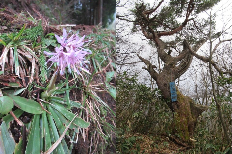 天気:曇りのち晴れ。昔に福井県大野の町から望んだ残雪の部子山、銀杏峯に登りたくて計画した山行。本来は1週前に行く予定だったが、天気が悪く1週ズラして決行となる。大野のコンビニで夜明けを待つが、夜が明けても厚い雲に覆われて暗い感じ。晴れの予報だったのにと思いながら登山口へ。名松新道から入山。雪は無く、春を告げるショウジョウバカマが咲き始めていた。松が所々に見られる尾根を進むと立派な仁王の松に着く。