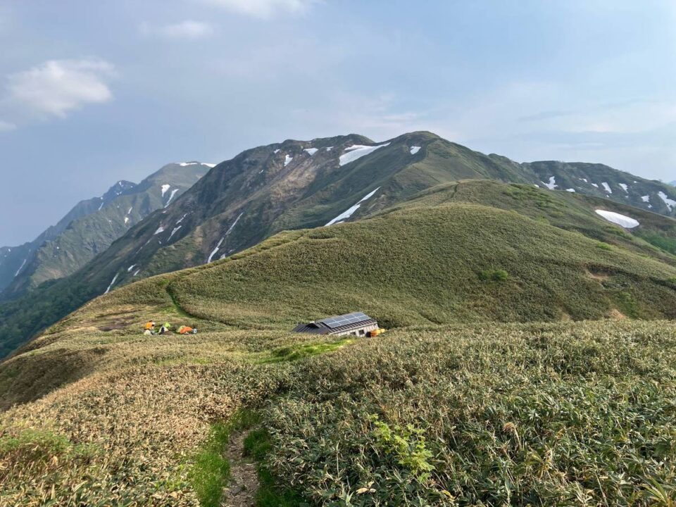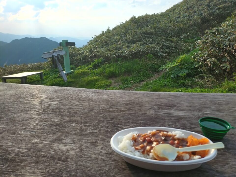 夕暮れ前に予定地である蓬ヒュッテに到着。1泊2食付き9500円 夕飯17:00~ カレー、朝食4:00 炊き込みご飯、フリーズドライのお味噌汁を頂く。ビールは当日は売り切れでした。ヒュッテから80m程下に沢があります。当日宿泊客は10名程。建物内上下2段となっており、上は男性、下は女性できっちり分かれる。当日は持込の夏用シュラフがやや暑く感じる程度で寒くは無かったです。(毛布の予備、折りたたみマットも人数分あり。)