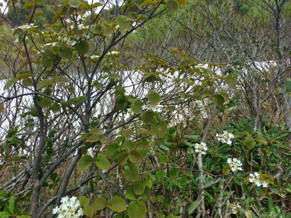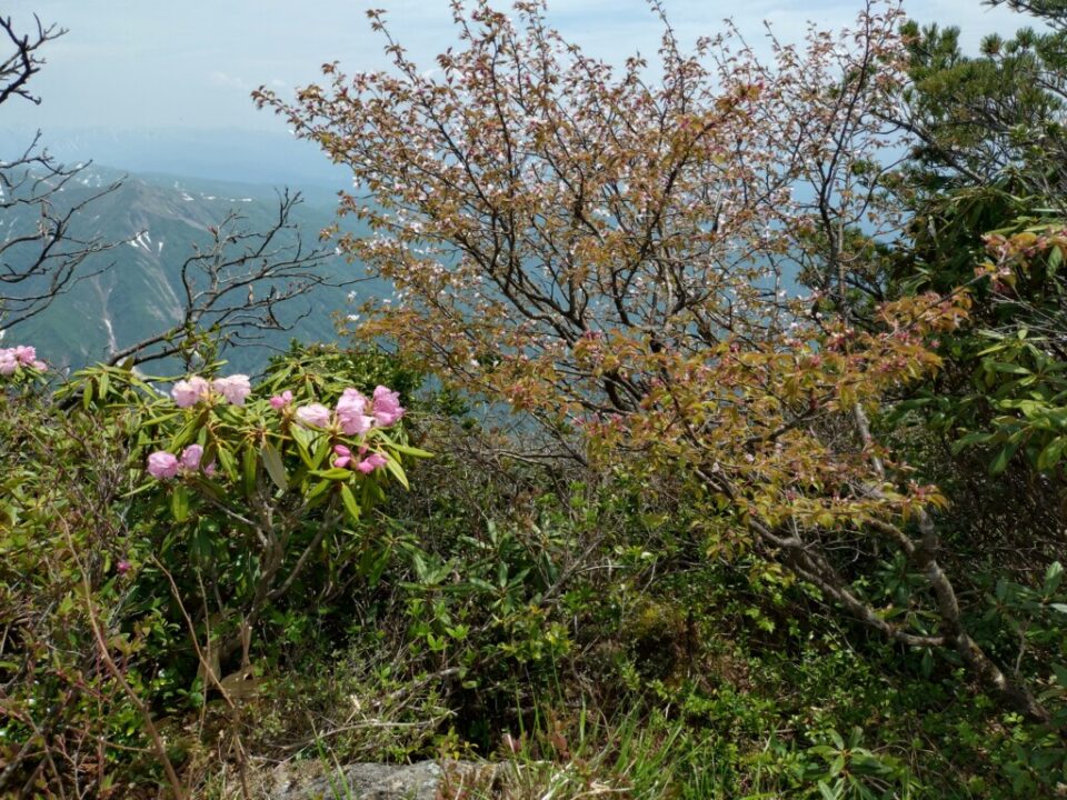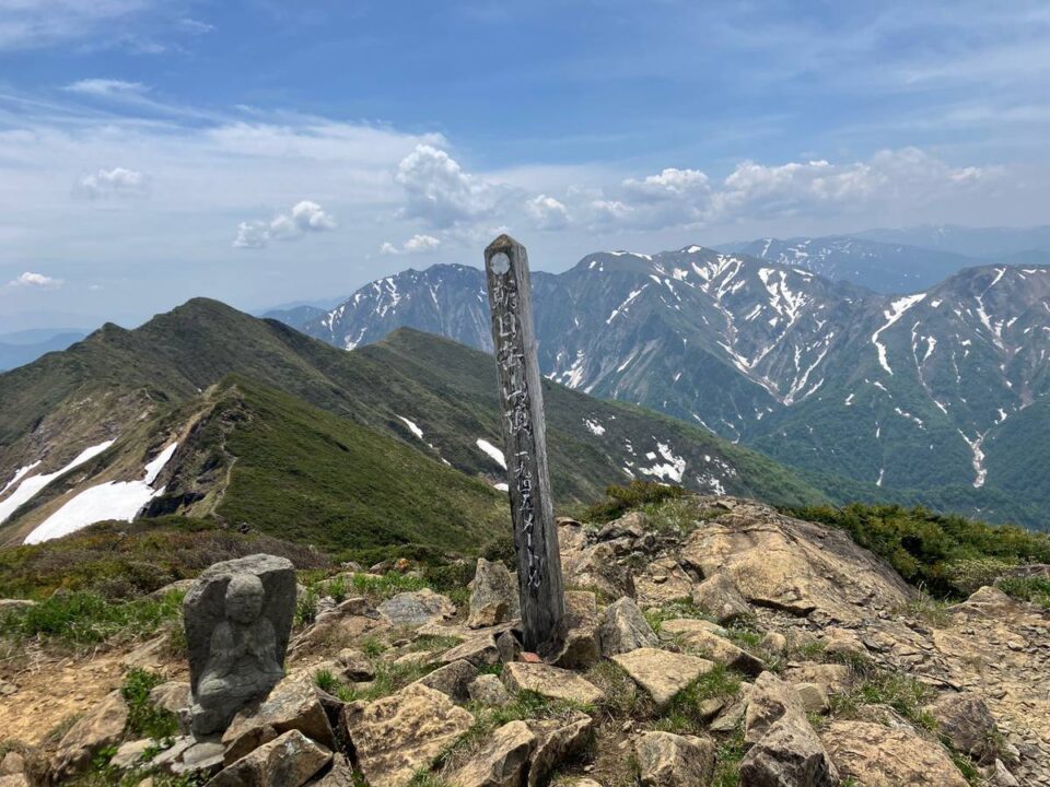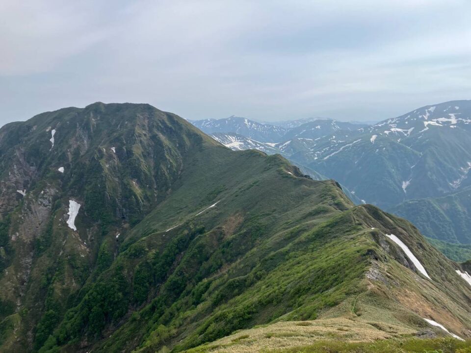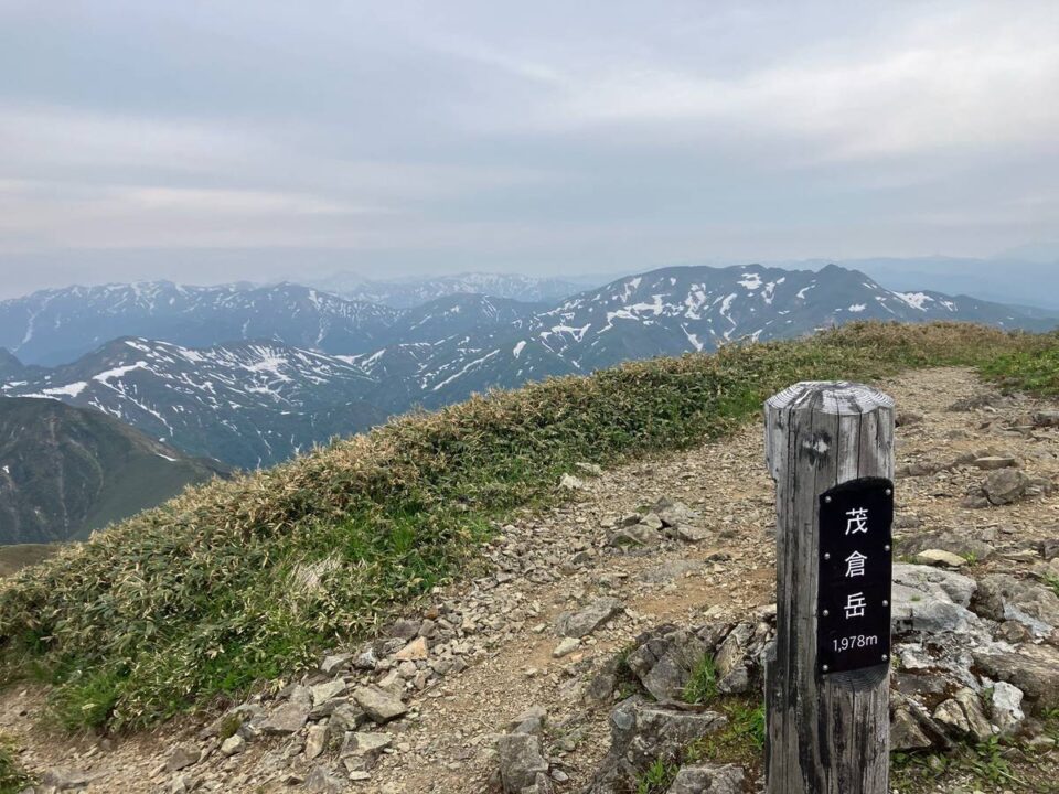 白毛門到着。これ以降登山ルート上に雪渓が出てきましたが平場を歩いたりとその都度アイゼンを使うほどでもない程度。山行時の時期を過ぎると梅雨時に入るが、2週間前は雪渓が残りすぎていたとの事で、タイミングは良かったとのではとMリーダー。