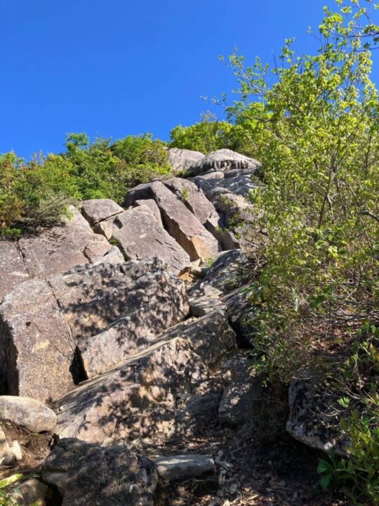 谷川岳(オキの耳)を望む最後の登り部分。岩肌の登りとなり、勾配もきつくなります。途中若干鎖場あり。