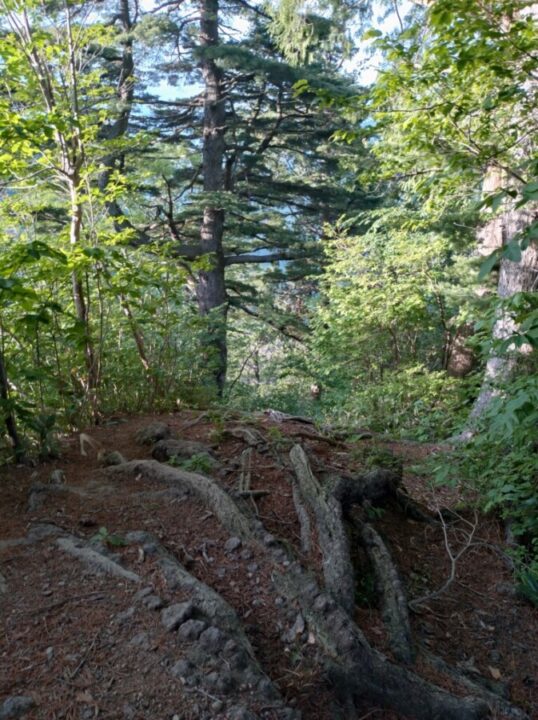 下山中、肩の小屋から200mほど雪渓をアイゼンで降りる。(今回アイゼンを使ったのは七ツ⼩屋⼭の登りと肩の小屋の下りの2か所)その後岩肌を降りるが、避難小屋からは樹林帯に突入。登山道も整備されておりとても歩きやすいです。そのまま、ロープウェー下の登山道で下山。林道をおりて駐車場到着。