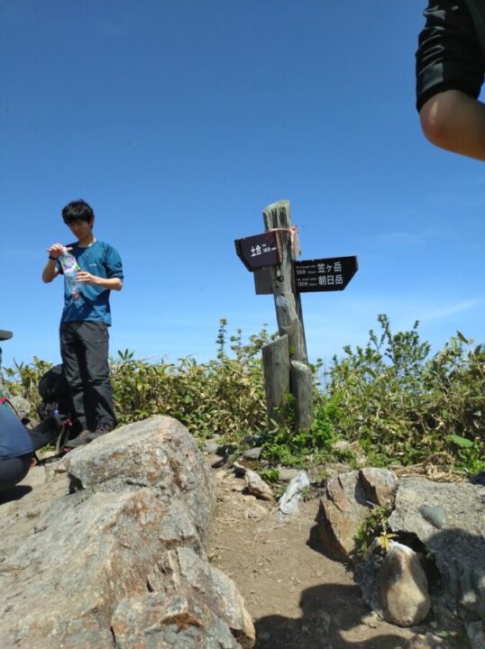 お昼近くに朝日岳登頂。日射がとても強かったですが風があり気持ち良い。これ以降は少し下りに入るため元気が出ます笑